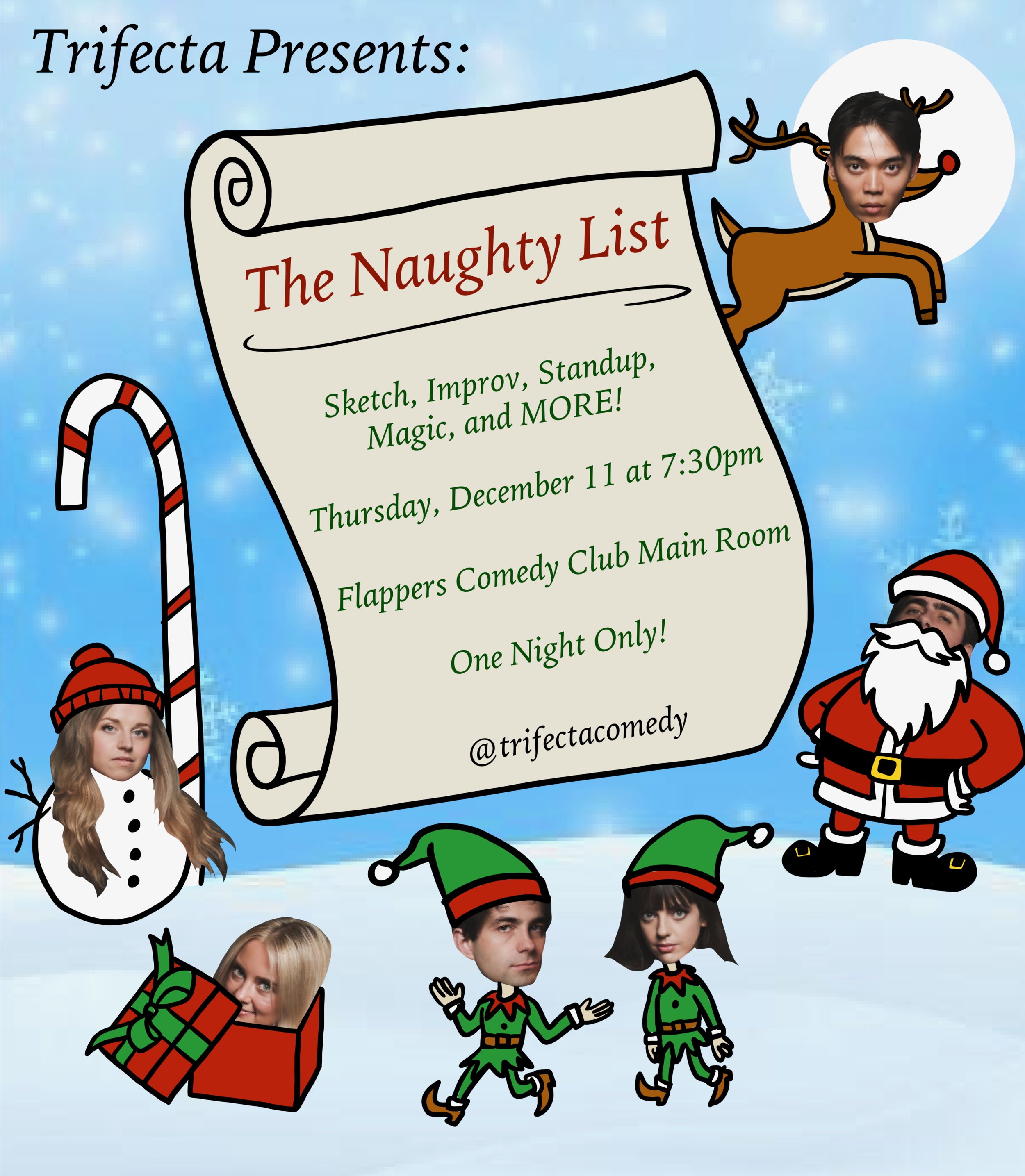 Join us Thursday December 11th for a new Trifecta Comedy show! Flappers Comedy Club Main Room at 7:30 PM. Don’t miss this ONE NIGHT ONLY event! Trifecta Presents: The Naughty List! Starring Kevin Phan, Sheridan Pierce, Katie Baker, Davey Jarrell, Marc Rosenzweig, and Portia Juliette of Trifecta Comedy! And featuring guest performances from Leash Kid, Trigger Happy, Snacks, Brendan Scannell, and Connor Mac! Sketch comedy, improv, standup, magic and more! We hope to see you then!